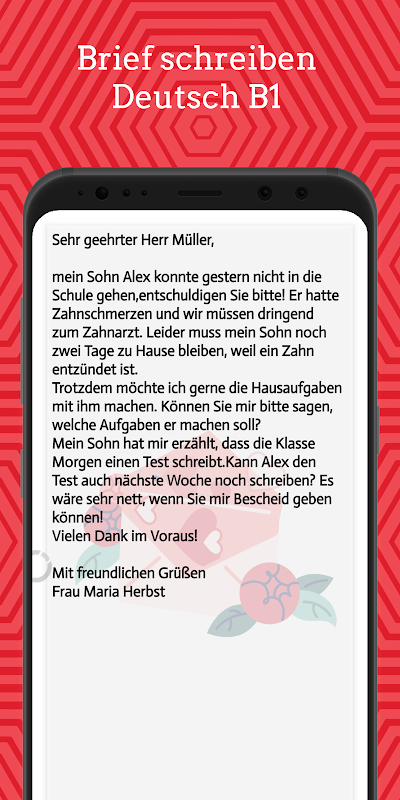 Mit Hilfe dieser Anwendung Brief schreiben Deutsch b1 ist es ganz einfach, einen Brief für die B1-Prüfung zu schreiben. Die besten Beispiele von Briefen für die Prüfung wurden Schritt für Schritt gegeben. Brief schreiben Deutsch b1 ist eine einzigartige App für Lernende, die Deutsch kurz schreiben lernen möchten.