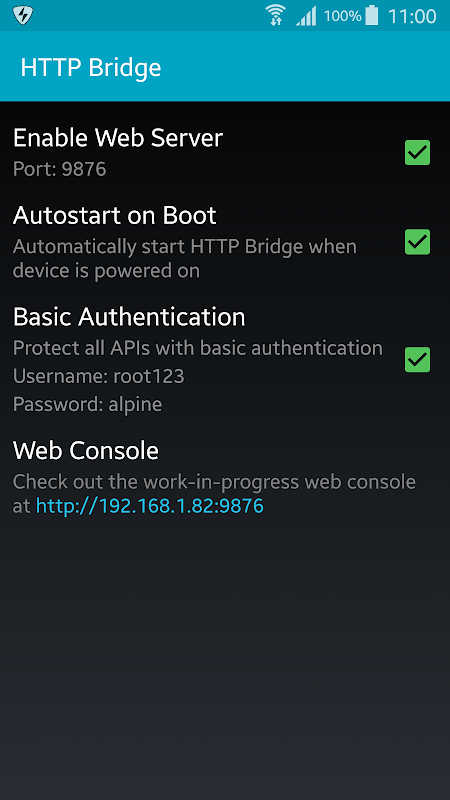 Diese App fungiert als HTTP-Brücke und lassen Sie Ihre Broadlink Geräte über eine einfache HTTP-URLs zu steuern (a.k.a curl Befehle). API-Syntax ist extrem benutzerfreundlich und gut dokumentierte rechts in der App. Es ist jetzt viel einfacher, RM-Gerät in Ihre Home-Automation-Setup zu integrieren.