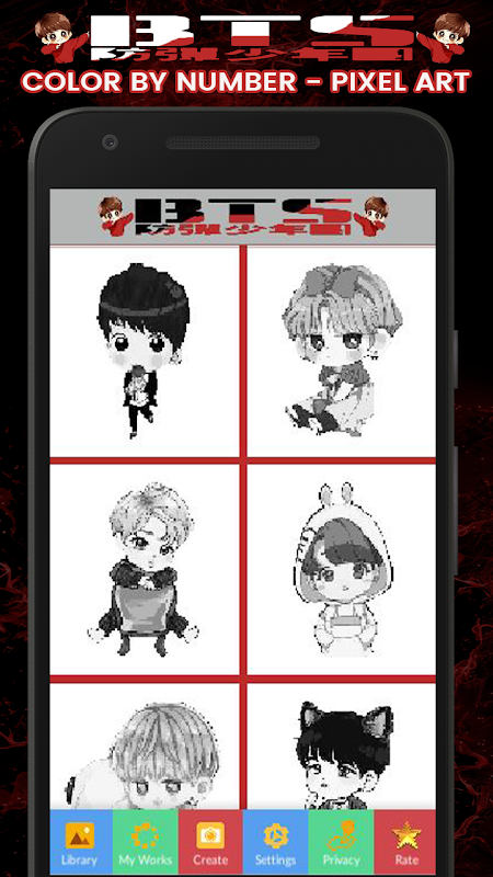 BTS Army Chibi Color By Number - Pixel Art Coloring is the free painting and drawing App for all fans BTS Army and BTS Chibi, nice chose for adults.