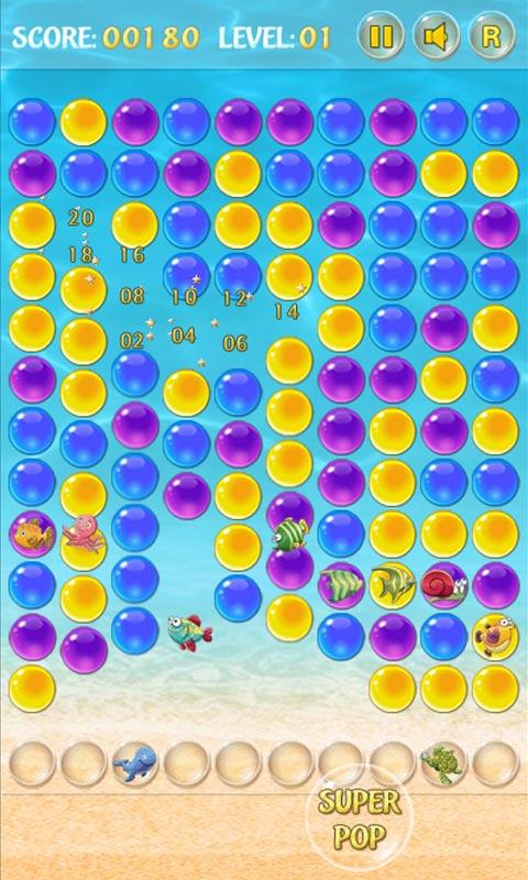 Kombiniere zwei oder mehr Blasen der gleichen Farbe, um das Level zu beenden, und rette die farbige Blase des Fisches, um die Kristallblase zu verbessern.