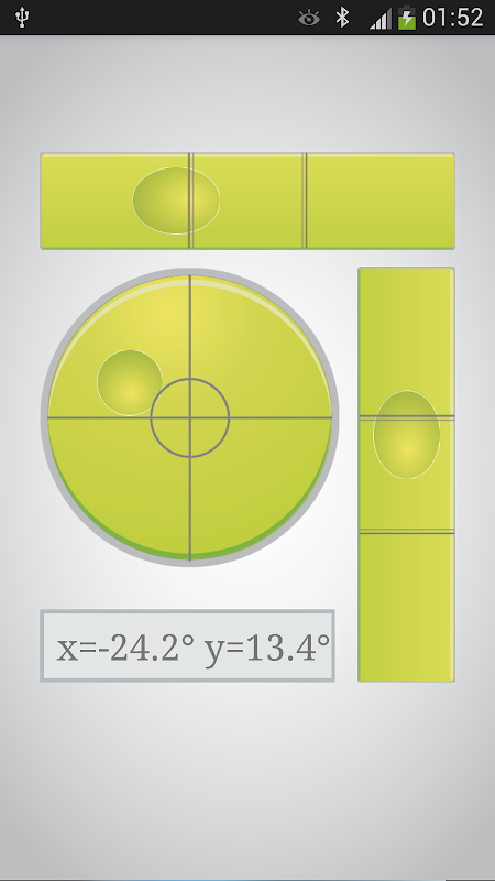 Vials on modern level meter have a slightly curved glass tube which is incompletely filled with a liquid, usually a colored spirit or alcohol, leaving a bubble in the tube. At slight inclinations the bubble travels away from the center position, which is usually marked. Bubble Level app tries to mimic the real level meter and displays the data as real level meter would.