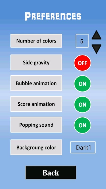 You can select your preferences of the gameplay from settings: 3 to 6 types of colors of bubbles, side gravity, bubble pop animation and score animation, bubble popping sound and background color (light or dark). Different settings of game set have their own highest record set.