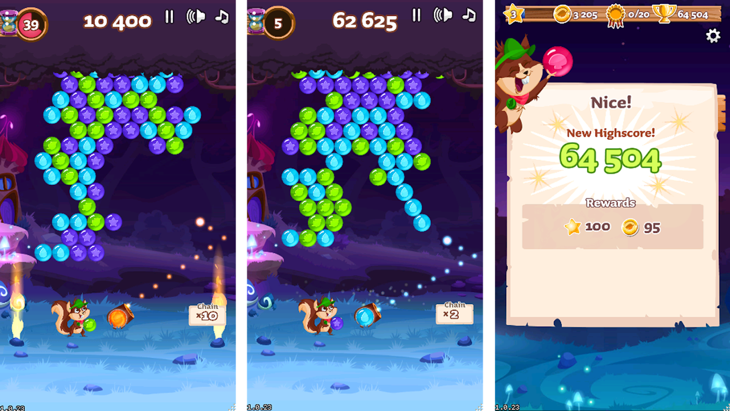 Although it may look adorably cute, Bubble Woods is a thrilling high score game experience. In 60 second rounds your only goal is to reach the highest score possible. Shoot the biggest clusters, use super effective power-ups, play strategically and be quick. This is not your average bubble shooter, this is Bubble Woods!