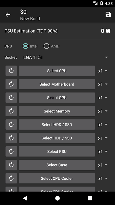 Mit dieser App können Sie Ihren eigenen PC erstellen, indem Sie verschiedene PC-Teile auswählen: CPU, Motherboard, Speicher, GPU, HDD / SSD, Netzteil, Gehäuse, CPU-Kühler usw. Sie erhalten auch eine ungefähre Schätzung des Gesamtpreises und der empfohlenen PSU-Leistung für Ihren Build.