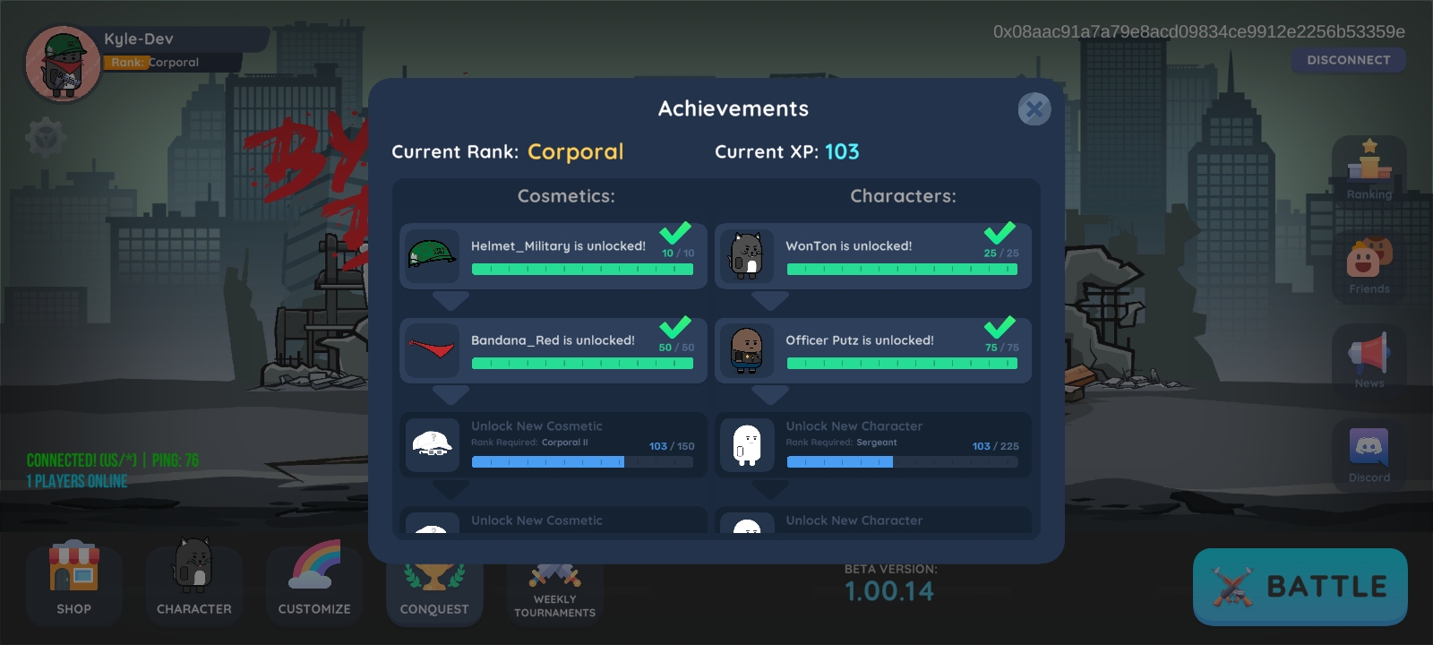 Players are able to customize their character with cosmetics, i.e. helmets, hats, masks, glasses, etc. The cosmetics are a separate NFT collection, and each cosmetic has a limited supply of editions. The cosmetics are for in-game use, and they can also be used to customize character NFTs in the in-game PFP generator. The avenues for obtaining cosmetics outside of purchasing them from the in-game marketplace are still to be defined.