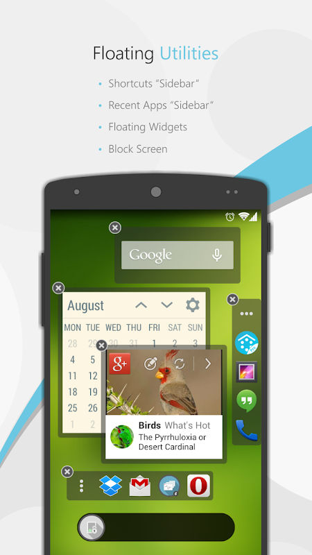Eine intuitive Multitasking-Lösung, die Sie alle Ihre Lieblings-Widgets, um ihre einzelnen »zusammen mit statistischen und Überwachungstools wie RAM und Batterie Statistiken Schwimmdock Windowpane« zuzuweisen. Jedes Fenster schwimmt auf alle anderen Anwendungen, der eine Interaktion mit mehreren Anwendungen zu einem Zeitpunkt. Ändern Sie die Größe und die Position jeder einzelnen schwebenden Fenster, um Ihre Vorlieben. Behalten Sie Ihre Lieblings-Shortcuts und Neuere Anwendungen und bequem starten sie durch die schwimmende »Sidebars«, oben auf jeder anderen Anwendung.