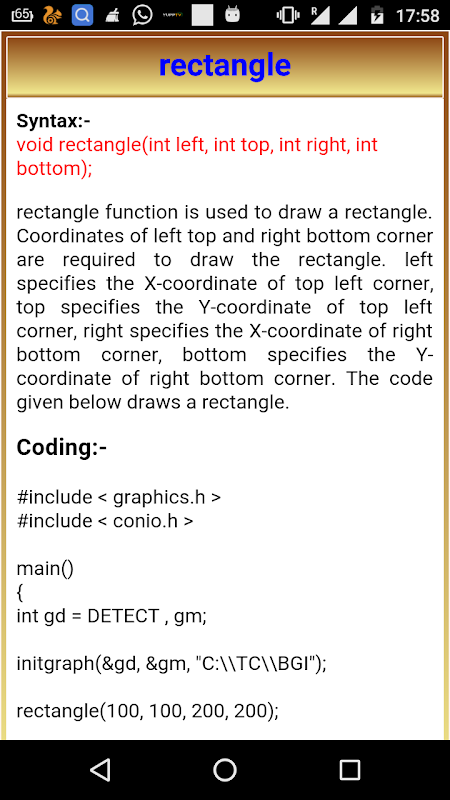 Diese C Graphics Tutorial App ist sehr nützlich für Anfänger Grundprogramme sowie erweiterte Programme zu lernen. Diese App deckt wichtige Programme für Interviewfragen. Jedes Programm erklärt mit Ausgang.