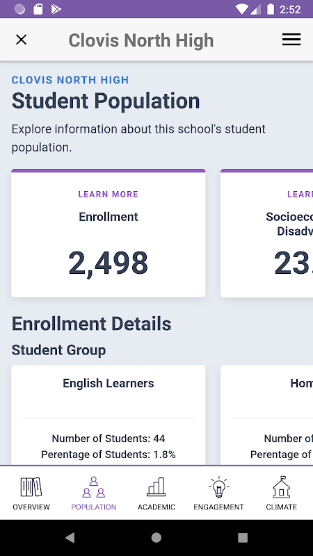 Kalifornier können mit der mobilen CA Dashboard-App auf einfache Weise auf Informationen zugreifen, die auf dem California School Dashboard basieren. Das Dashboard ist das neue kalifornische System zur Rechenschaftspflicht und hilft Eltern und Erziehern, Stärken und Verbesserungspotentiale zu identifizieren. Über das Dashboard berichtet Kalifornien, wie Distrikte, Schulen (einschließlich alternativer Schulen für Hochrisikoschüler) und Studentengruppen über staatliche Maßnahmen hinweg auf lokale Indikatormaßnahmen reagieren.