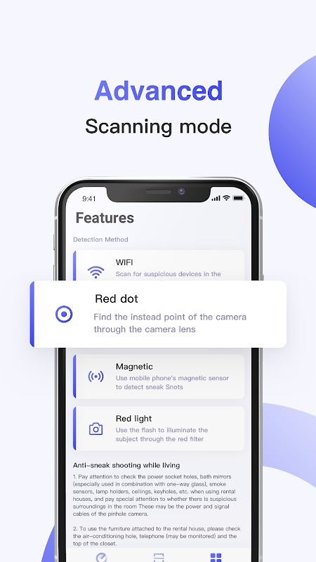 Camera Finder, als einer der besten Spionagekamera-Detektoren und Sucher für versteckte Kameras, ist eine einfache und benutzerfreundliche Anwendung. Diese benutzerfreundliche Anwendung hilft Ihnen, versteckte Kameras und Mikrofone in Ihrem Miethaus, Zimmer, Hotel, Apartment und an öffentlichen Orten auf einfache Weise zu scannen, zu erkennen, zu finden und zu lokalisieren. Schützen Sie sich und die Privatsphäre Ihrer Familie ohne Ausgaben
