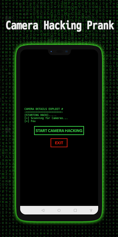 How does it work? "Camera hacking prank" shows you a text area and on your command of the "hack" button will being the "hacking", with hack text being typed out!