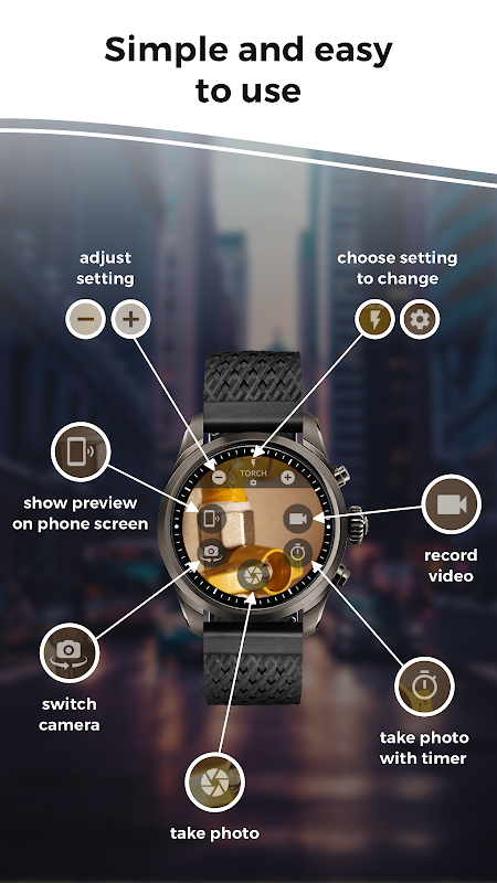 ● Verwandeln Sie Ihr Telefon mit Ihrer Smartwatch in eine ferngesteuerte Kamera - passen Sie Zoom, Belichtung, Blitz an und wechseln Sie zwischen Haupt- und Selfie-Kamera