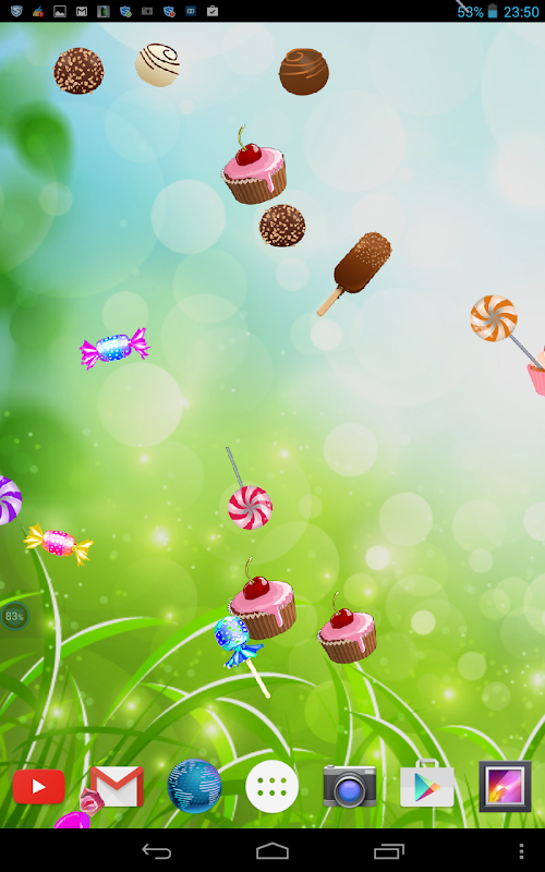 While you swipe your way through the menus of your smartphone or tablet real candy rain of sweets, chocolate sweets, lollipops, ice creams and cherry cake will fall on your screen with purpose to make you forget all your problems and feel again like a child.
