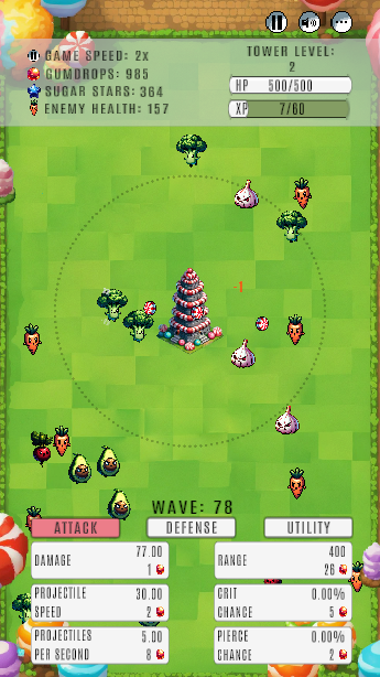 Jede Welle bringt eine beeindruckendere Auswahl an pflanzlichen Feinden mit sich, die dich dazu drängen, deine Verteidigungsstrategien kontinuierlich weiterzuentwickeln. Schnelles Denken, clevere Planung und strategische Verbesserungen des mit Süßigkeiten überzogenen Arsenals deines Turms sind überlebenswichtig.