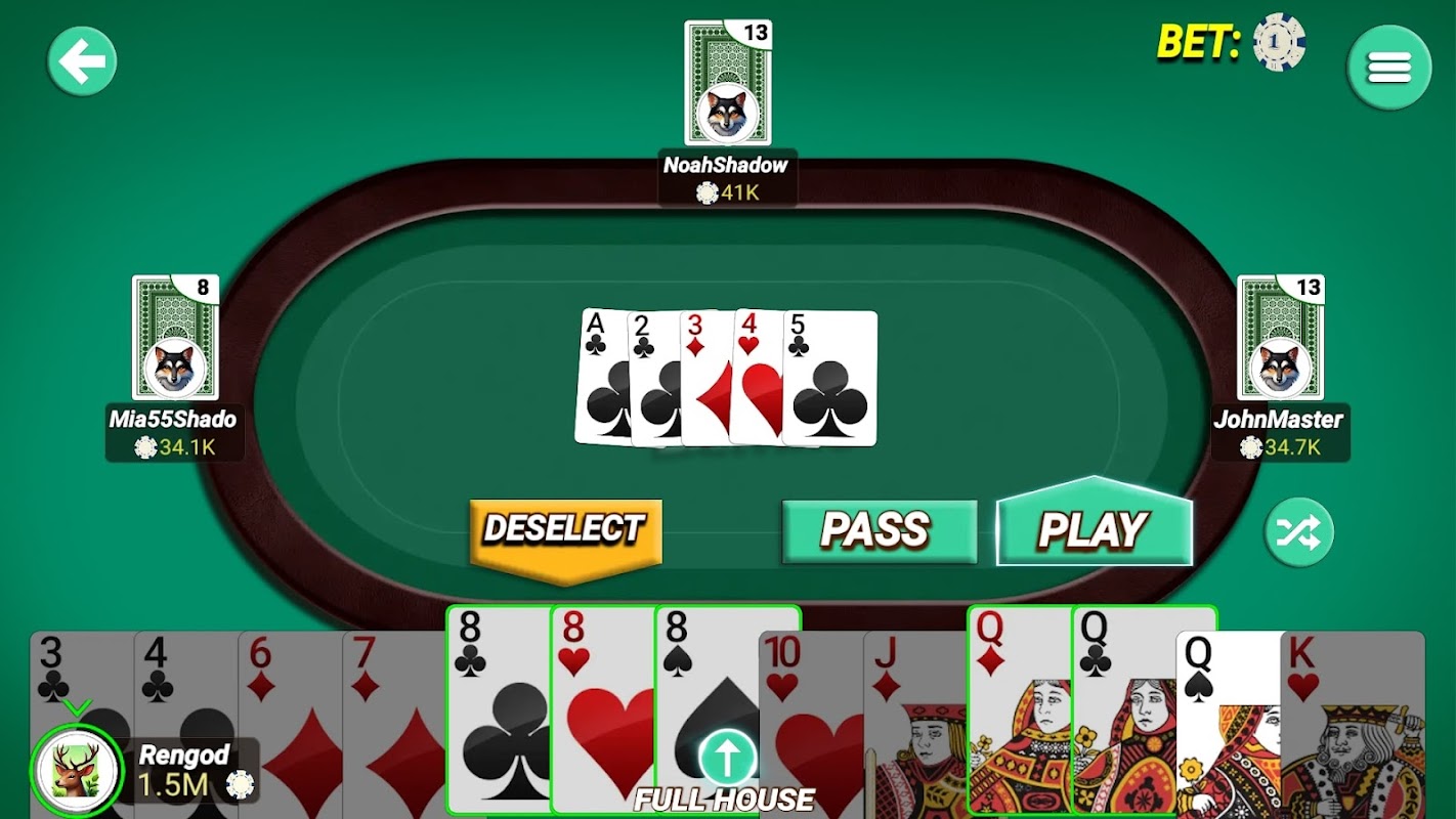 - Klassisches Capsa Banting-Gameplay mit 13 Karten.