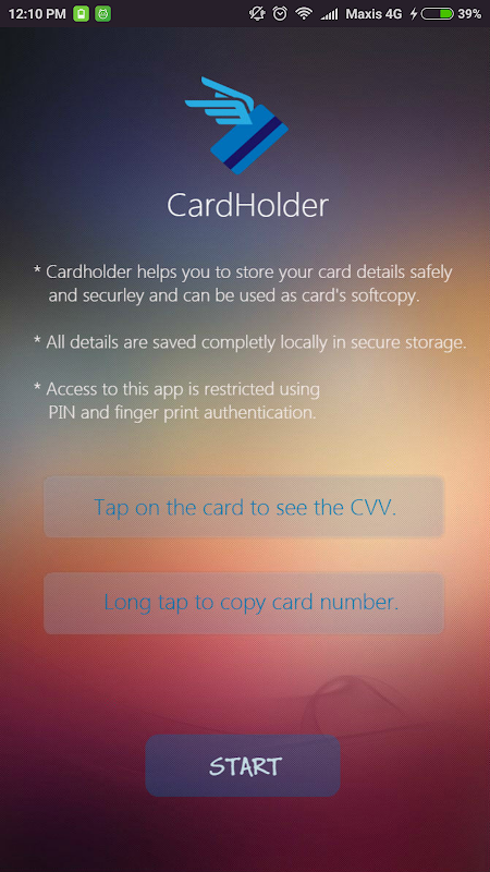 Karteninhaber können Sie Ihre Debit- / Kreditkartendaten sicher speichern und sicher und kann als Karte weiche Kopie verwendet werden. Alle Angaben sind vollständig lokal in sicherer Lagerung gespeichert. Der Zugang zu diesem App ist eingeschränkt mit PIN und Fingerabdruck-Authentifizierung.