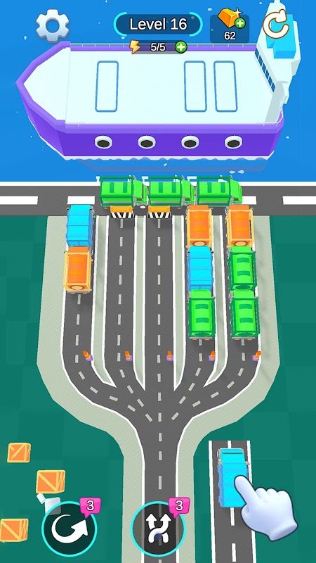 Jedes Level im Spiel ist ein einzigartiges Logistikpuzzle. In den ersten Levels wirst du dich mit den grundlegenden Regeln des Spiels vertraut machen. Auf dem Bildschirm sind farbenfrohe Transportfahrzeuge auf den komplexen Hafenstraßen angeordnet, und Ihr Ziel ist es, die Fahrtrichtung des Fahrzeugs durch Schiebebildschirm anzupassen, damit es in eine Entladebahn gelangt, die der Karosseriefarbe entspricht. Nur wenn die Farben genau abgestimmt sind, kann die Güter reibungslos entladen werden und Platz für weitere Transportaufgaben schaffen.