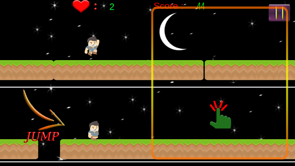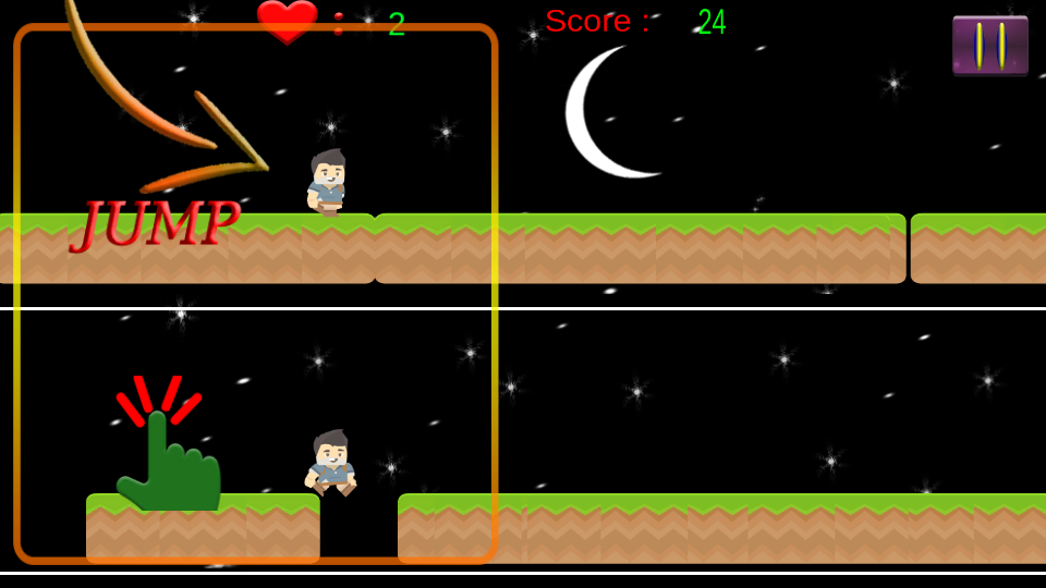 When You click on right side of the screen , the lower running character jumps and when on left side of the screen , the upper character jumps.