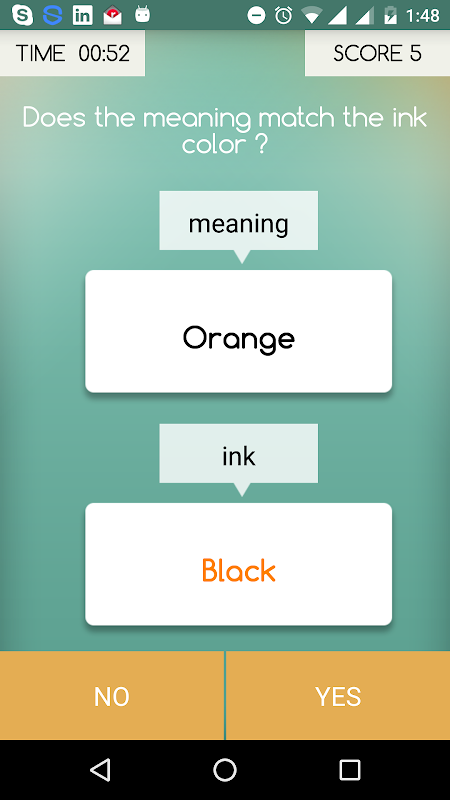 If color name matches the text color, press ‘Yes’ otherwise ’No’ and you'll have 2 seconds to choose your option.