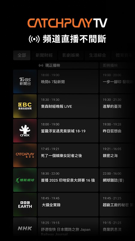 [Premium-Inhalte × Ausgewählte Kanäle: Die All-in-One-Plattform] CATCHPLAY+ integriert nahtlos Streaming-Video-on-Demand mit Live-TV-Sendern. Genieße das Beste aus beiden Welten – sofortige Wiedergabe und Live-Übertragungen. Unsere neuen „Light Channels“ bieten nationale und internationale Nachrichten, Sport und Idol-Dramen – perfekt für die Bedürfnisse moderner Streamer.