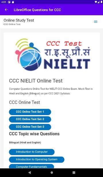 CCC LibreOffice question is a test preparation app for the NIELIT Course on Computer Concepts. All Questions and Options are Bilingual in Hindi and English. As per latest syllabus of CCC Computer Certificate Course LibreOffice questions are being asked in Online Test in place of MS Office. We have included questions from Writer, Calc and Impress of LibreOffice. Important Questions from the previous CCC exams are regularly updated. Mock Test of CCC Exam Questions from LibreOffice are also included. Enjoy the quality questions in Hindi and English