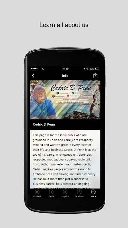This page is for the individuals who are grounded in Faith and Family,are Prosperity Minded and want to grow in every facet of their life and business Cedric D. Penn is at the top of his game. A renowned entrepreneur, respected motivational speaker, radio talk host, author, marketer, and master coach, Cedric inspires people around the world to embrace positive thinking and find prosperity. He has built more than just a successful business career; he’s created an ongoing legacy of love and encouragement for his family, friends, and followers.