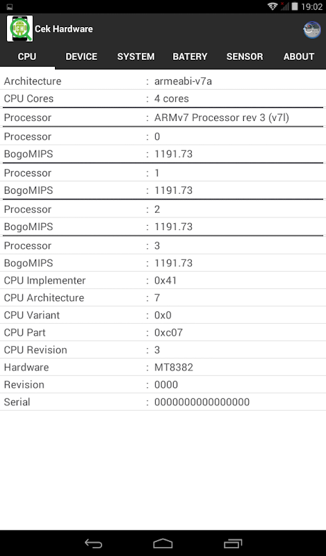 Cek Perangkat Keras Aplikasi dapat memberikan informasi spesifikasi terperinci dari ponsel cerdas Anda. Prosesornya digunakan, jumlah core prosesor, resolusi kamera, sistem operasi, baterai dan informasi lainnya.