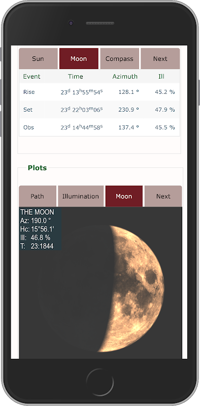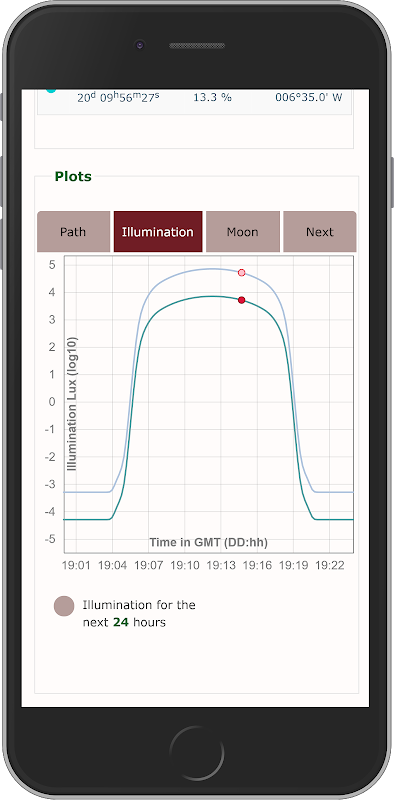Die App berechnet die Bodenbeleuchtung von Sonne und Mond für jeden Ort auf der Erde