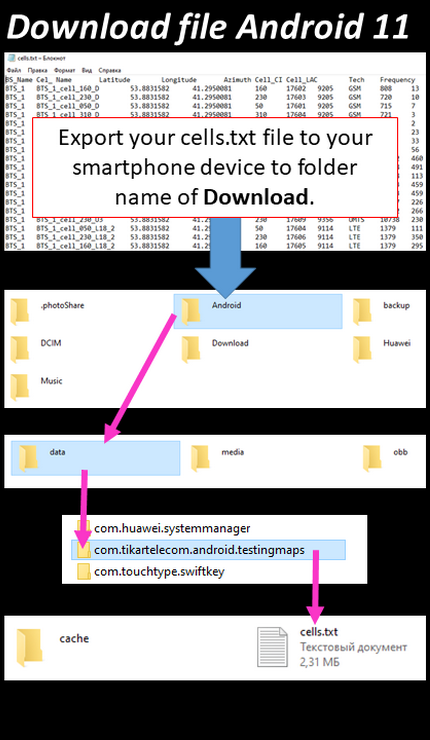 For Android 11 cell file must export to "Android/data/com.tikartelecom.android.testingmaps/cells.txt"