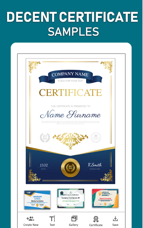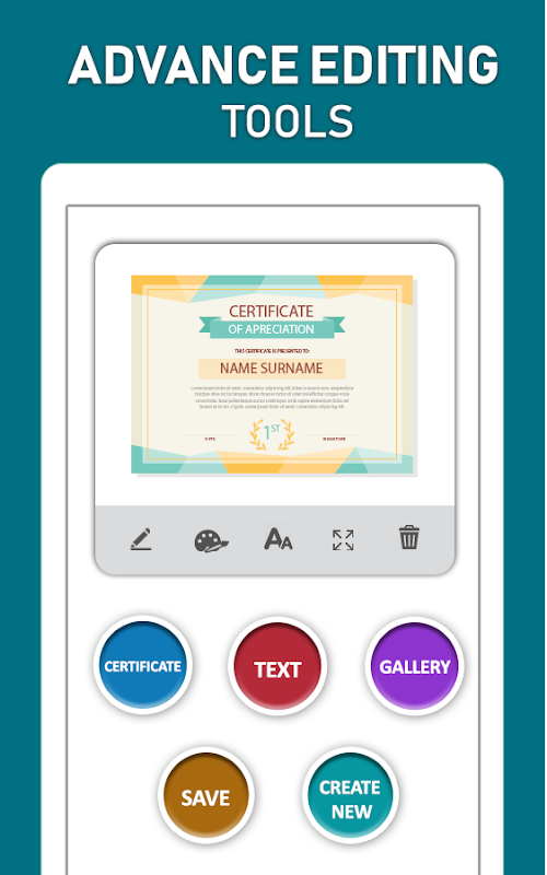 Design or create certificates as you want with different text styles & resizing of text you type, Certificate maker or creator is free hand application, just select certificate template of your choice & write text of your choice on that template. Certificate maker app helps in creating certificates & also helpful in creating professional certificates for an organization.