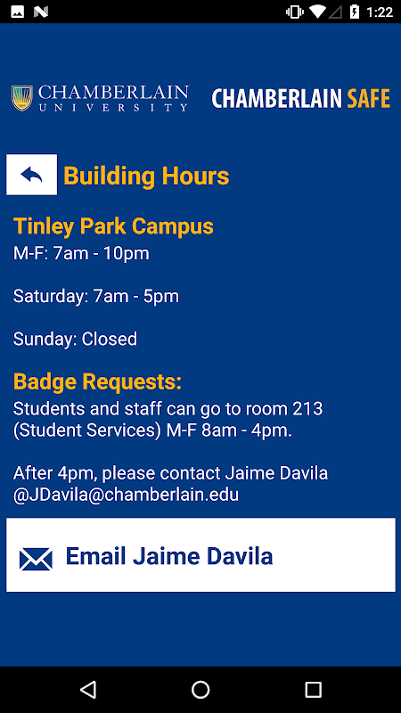 - Sicherheitsbenachrichtigungen: Erhalten Sie sofortige Benachrichtigungen und Anweisungen der Sicherheit der Chamberlain University, wenn Notfälle auf dem Campus auftreten.