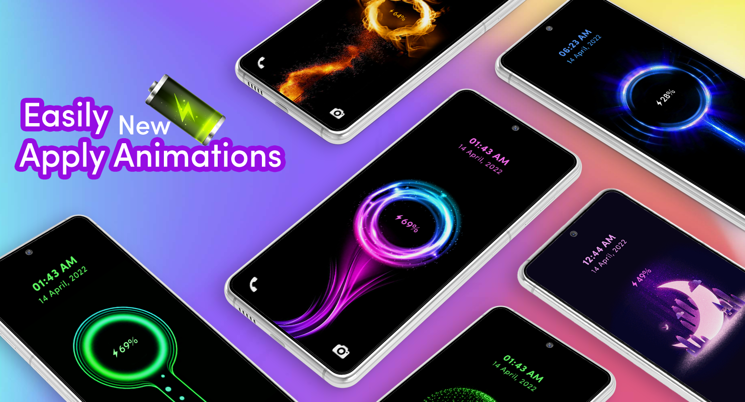 Holen Sie sich attraktive animierte Bildschirme mit Ladeanimation und wirklich coolen Animationsgrafiken für ein besseres Aufladen. All dies kann auch durch Ihre Wahl von Textfarben und Hintergründen angepasst werden.
