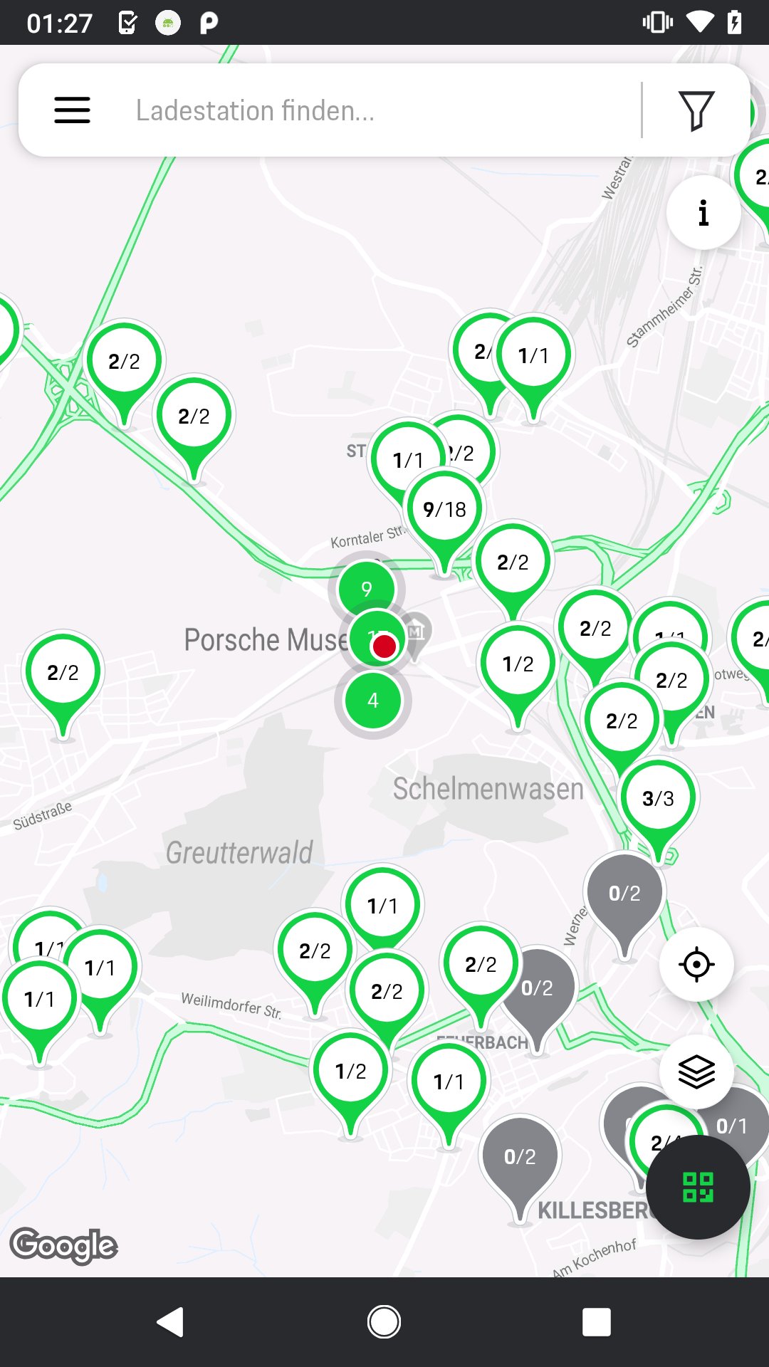 • Anzeige detaillierter Informationen der Ladesäule in der Detailkarte (Verfügbarkeit, Bilder der Ladestation, Zugang, Zeitpunkt des letzten Ladevorgangs, Adresse, Leistungsklasse, Preise, Beliebte Zeiten)