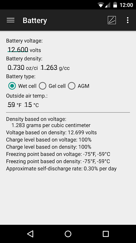 - Batteriespannung, Dichte, clarge Ebene, Gefrierpunkt und Selbstentladung