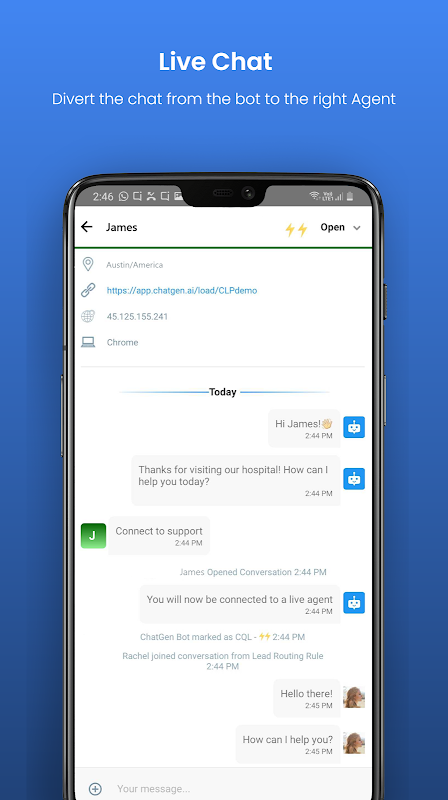 Chatgen ist eine hybride Messaging-Chat-App, die mit einer Kombination aus benutzerdefinierten Chatbots und Live-Agenten in Echtzeit mit Ihren Website-Besuchern und auch mit Ihrem Social-Media-Publikum kommunizieren kann.