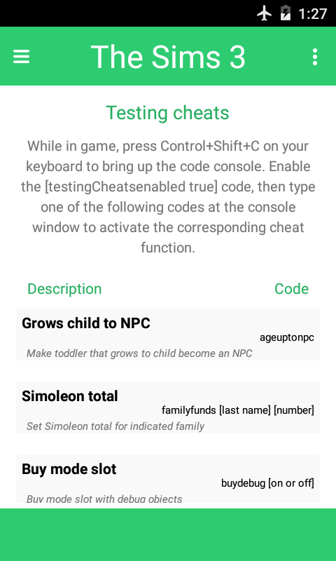 Cheat codes for the Sims includes all the newest cheats for the Sims. All the cheats are easily accessed on your phone, anytime, since the app doesn't require internet to work. The cheats have been conveniently sorted into categories, so any cheat can easily be found.