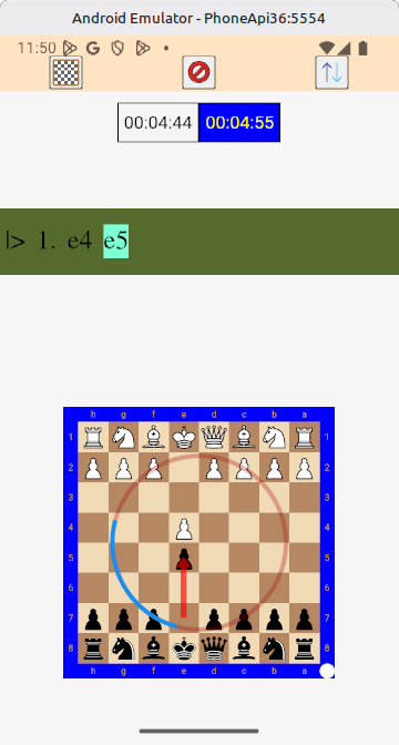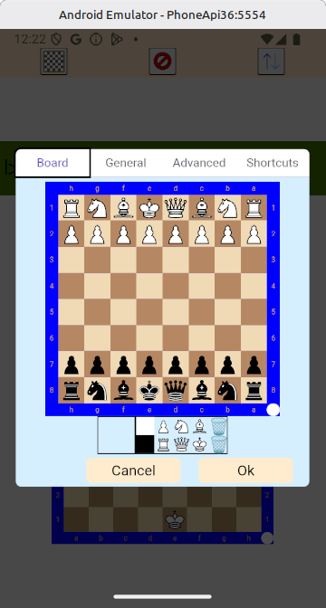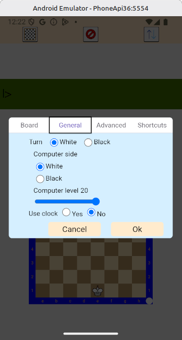 Du kannst die Startposition, den Schwierigkeitsgrad der Engine (0–20), die Brettausrichtung und die Bedenkzeit anpassen.