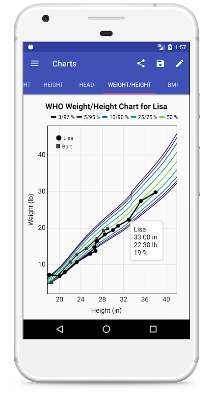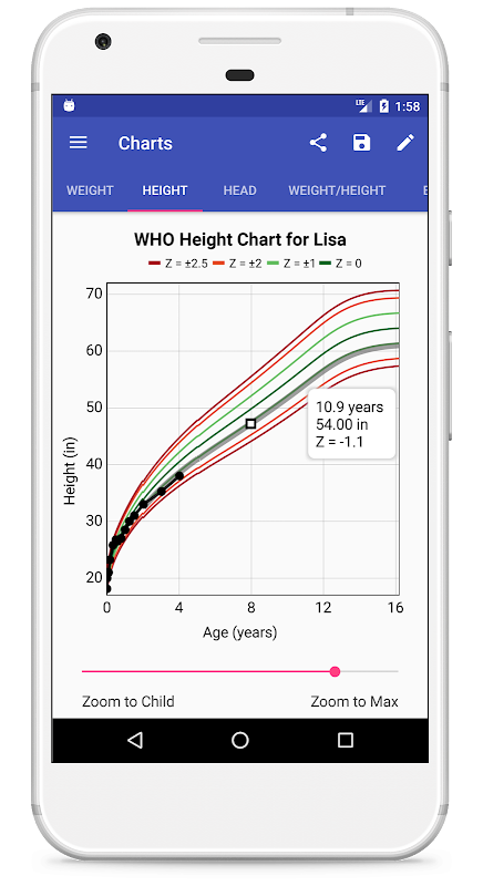 Sie können Bilder der Diagramme oder Perzentiltabellen Ihres Kindes speichern, um sie zu teilen, in ein Babybuch einzufügen oder um sie mit dem Arzt Ihres Kindes zu besprechen. Exportieren und importieren Sie Daten einfach in ein offenes CSV-Format. Erstellen Sie einen PDF-Bericht mit einem Wachstumsdiagramm und einer Perzentiltabelle. Vergleichen Sie die Wachstumskurven mehrerer Kinder oder geben Sie die Daten eines Elternteils ein und vergleichen Sie Kind mit Elternteil. Projektwachstum bis zum Ende jeder Kurve.