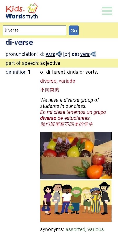 Das Wordsmyth-Kinderwörterbuch bietet spezielle Unterstützung für Englischlerner, deren Muttersprache Spanisch oder Chinesisch ist. Alle 14.000 Stichwörter in jeder Hinsicht wurden ins Spanische und Chinesische übersetzt. In Fällen, in denen ein Schlagwort nicht mit gleichwertigen Wörtern übersetzt werden kann, wird zusätzlich zu einem wörtlichen eine liberale Übersetzung bereitgestellt. Außerdem wurde jeder zu einer Definition gehörende Beispielsatz übersetzt. Dies gibt einem Kind ein klares Verständnis dafür, welche Bedeutung das Wort in seiner eigenen Sprache hat und auch ein starkes Gespür dafür, wie es in der Welt verwendet wird und wie wichtig es für das Lernen ist.
