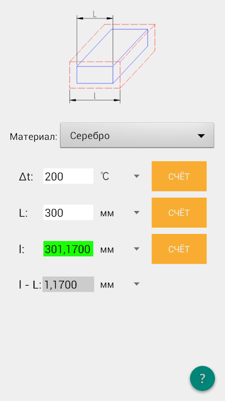B6. "Wärmeausdehnung" - basierend auf ausgewähltem Material (es gibt 18 verschiedene Materialien), Temperaturschwankungen und Längenabmessungen des Teils berechnet dieser Bildschirm die ausgedehnten Längenabmessungen. Oder basierend auf zwei linearen Dimensionen kann die zum Erreichen einer solchen Dimensionsdifferenz erforderliche Temperaturänderung berechnet werden.