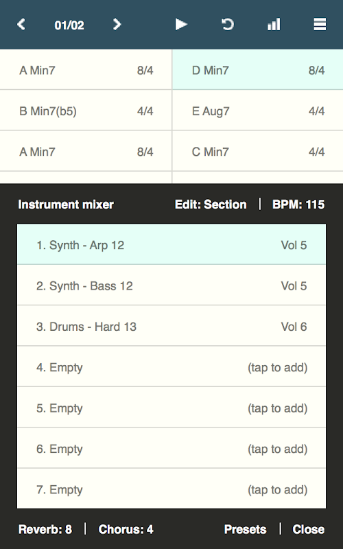 Verwenden Sie es für Songwriting-Experimente, um Backing-Tracks zum Soli-Üben zu schaffen oder einfach nur zum Spaß. Machen Sie Arrangements und Mixes ganz einfach aus Hunderten von Klavier-, Gitarren-, Synthesizer-, Bass- und Drum-Tracks.