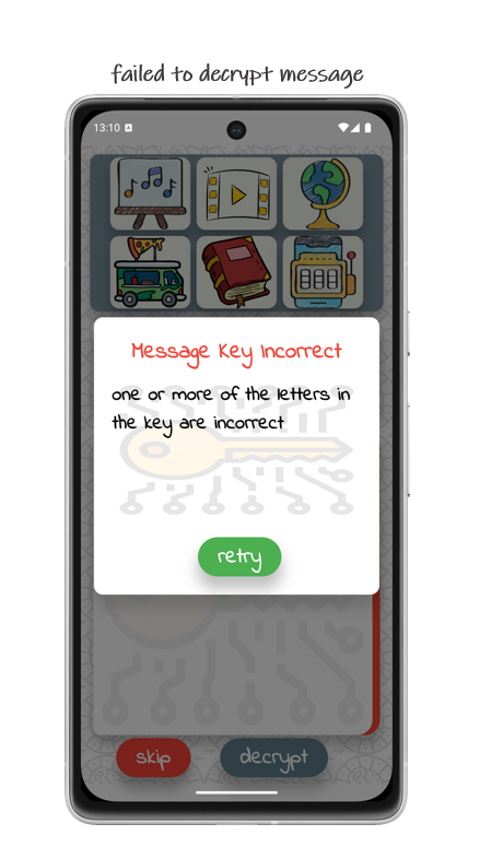 Sobald alle sechs Fragen beantwortet wurden, erscheint der Entschlüsselungsbutton. Durch Tippen auf den Button wird die Nachricht entweder entschlüsselt oder Sie erhalten die Information, dass ein oder mehrere Buchstaben falsch sind.