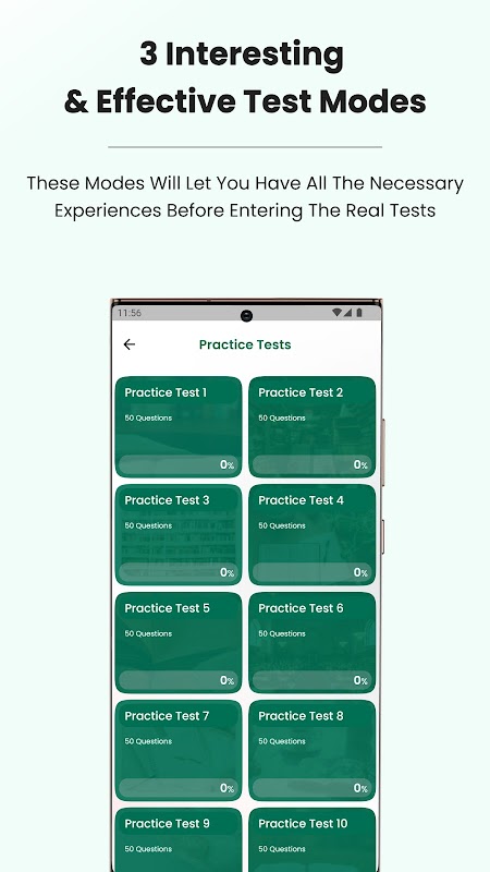 • Probetest: Verschiedene vollständige Tests ermöglichen es Ihnen, sich mit dem Testformat vertraut zu machen. Wenn Sie den Test abgeschlossen haben, sehen Sie Ihre Punktzahl und können alle Fragen überprüfen.