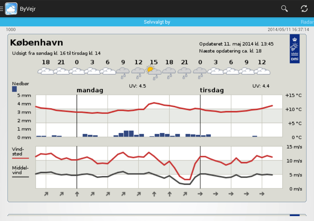 ByVejr bezieht seine Wetterdaten von DMI und YR, sodass Sie die beiden Wetterdienste einfach vergleichen und sich den besten Überblick über das Wetter verschaffen können.