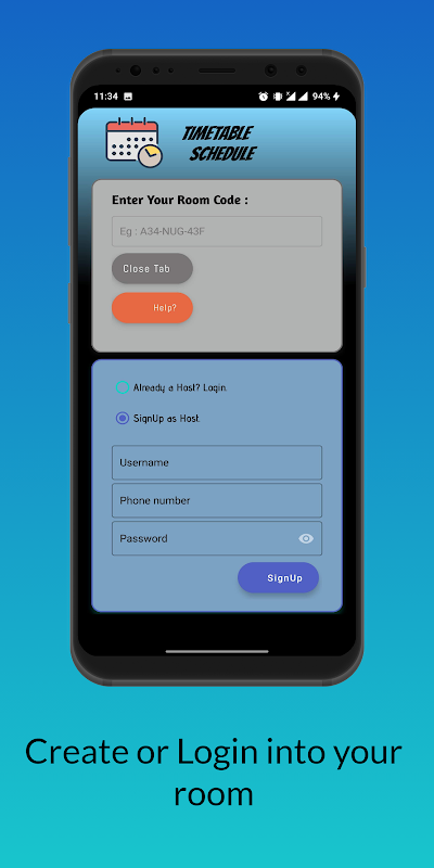 • Timetable Schedule application lets the user(host-user) set Subject-list and lecture timings after which a room-code is generated which then can be circulated among the students.