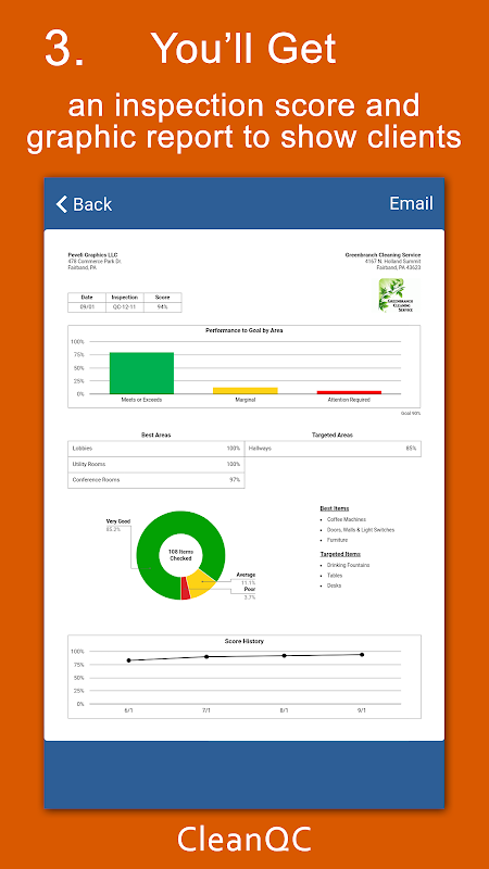 • Binden Sie Kunden ein! Sie werden es lieben, unsere einzigartige „Leistungsbewertung“ zu jeder Inspektion, für jeden Kunden und zu jeder Zeit per E-Mail oder persönlich zu übermitteln – und Ihre Qualitätskontrollbemühungen in einem leicht verständlichen grafischen Format hervorzuheben.