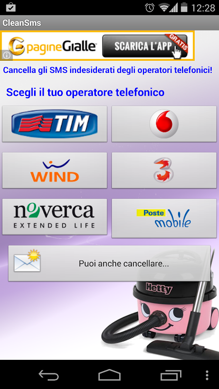 Volete cancellare gli sms noiosissimi dei vostri operatori? Tipo “Hai ricevuto una chiamata da..” oppure “Sono di nuovo contattabile.. ChiamaORA!” che si sommano nella tua rubrica SMS? Clean SMS pulisce automaticamente questi tipi di messaggi in modo completamente automatico dalla tua rubrica.E' disponibile per gli operatori TIM, VODAFONE, WIND,NOVERCA, TRE, POSTE MOBILE. Se volete che il programma cancelli altri tipi di messaggi, contattatemi pure, sarà un piacere implementare la vostra richiesta.