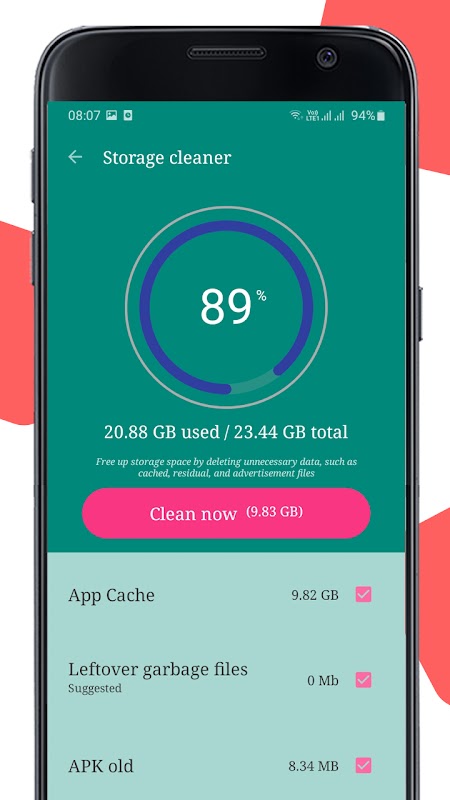 ✔ Bereinigen Sie den Speicherplatz, um mehr Speicherplatz zum Speichern von Dateien zu schaffen, und entfernen Sie nicht verwendete Dateien, alte APK-Dateien und redundante Dateien im Speicher