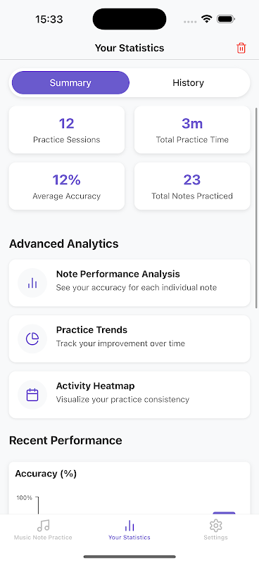 Ihre Statistiken: Verfolgen Sie Ihren Fortschritt im Laufe der Zeit im speziellen Statistikbereich. Sehen Sie, wie sich Ihre Notenerkennungsfähigkeiten verbessern! (Sie können hier etwas näher darauf eingehen, wenn im Statistikbereich bestimmte Messwerte wie Genauigkeit %, Notizen pro Minute usw. angezeigt werden.)