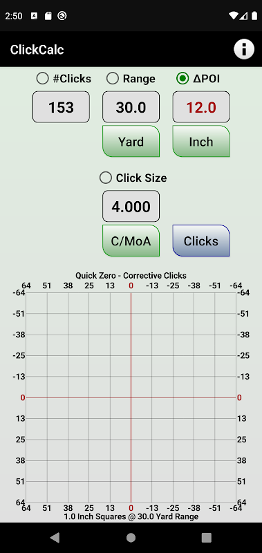 ClickCalc ist eine Kalibrierungs-App, mit der die Eigenschaften eines Zielfernrohrs "Klicks pro MoA" genau bestimmt werden können.