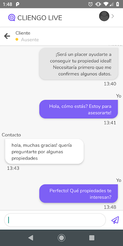 La app de Cliengo es la versión móvil de Cliengo Live, el chat en vivo. Recibe notificaciones push en tu teléfono móvil en el momento en que un cliente se conecta al chat de tu sitio para conversar con ellos. Sigue todas las charlas en tiempo real, y elige cuáles intervenir para cerrar una venta en el momento justo.